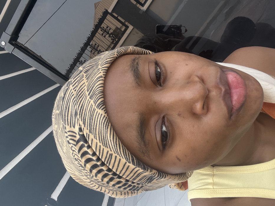 A young woman poses for a selfie. She wears a patterned headscarf and a yellow tank top. Her complexion is smooth, and her lips appear slightly chapped. She looks directly into the camera with a neutral expression. The background features a glossy surface, possibly a vehicle, reflecting the blurred image of a building with a decorative fence. The composition is slightly off-kilter, with the woman's face occupying the majority of the frame.