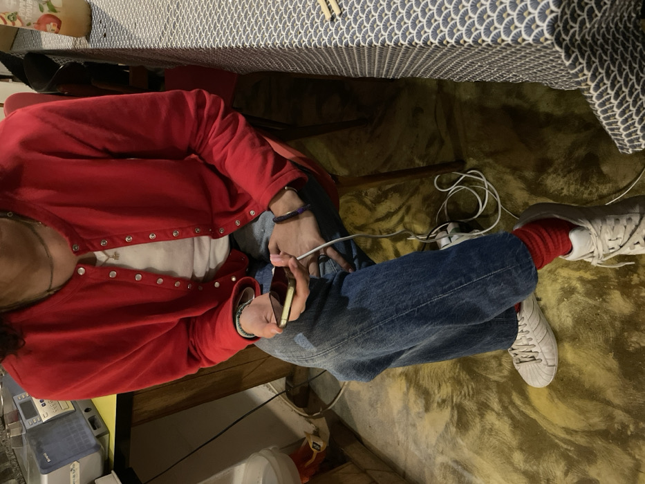 A person sits in a chair, wearing a red cardigan over a white shirt, blue jeans, and white sneakers with red socks. The individual is holding a smartphone, appearing to use it. A tangled white phone charging cable is near the legs. The person is under a table with a patterned tablecloth. The floor appears to be a greenish, mottled color.