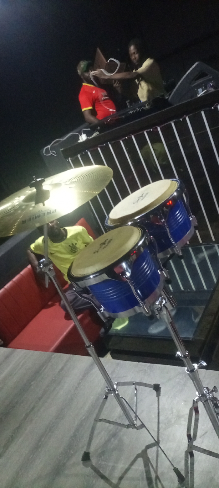 A dimly lit indoor scene features two blue bongos with silver hardware on stands