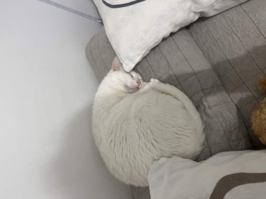 - "A white domestic cat is observed sleeping, curled tightly into a ball on a grey quilted blanket" by FM-c0TAr1, licensed under CC BY 4.0
