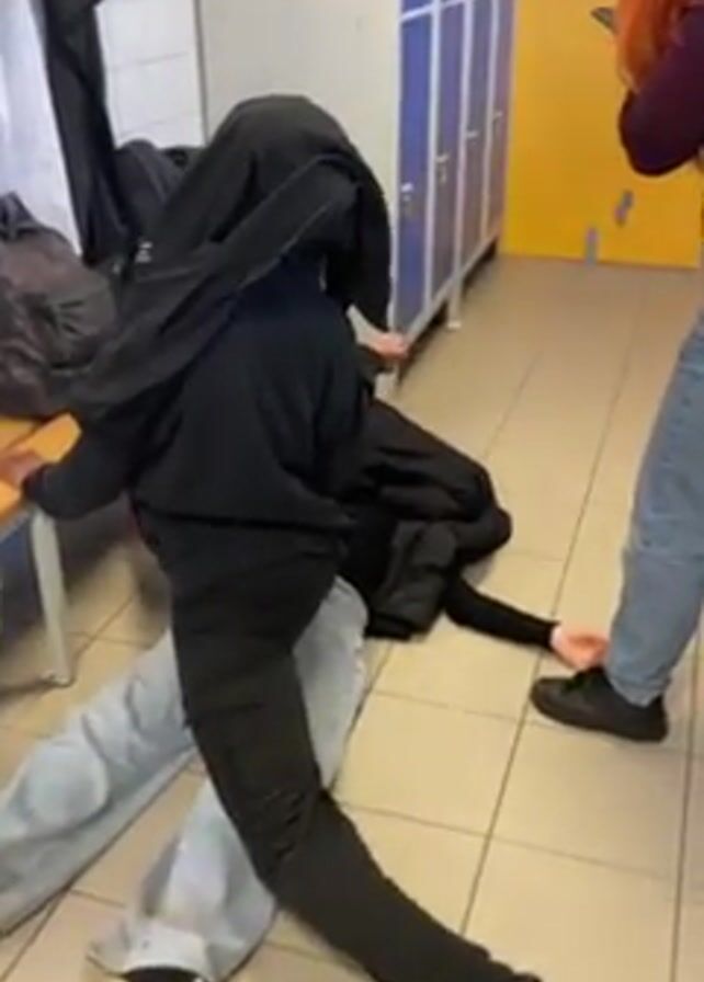 In what appears to be an indoor locker room setting with lockers lining one wall and a bench and wall hooks on another, three individuals are visible. Two individuals are lying on the tiled floor: One person, wearing light blue jeans and black and white sneakers, is lying flat on their back, with a second person, wearing black pants and colorful shoes, sprawled atop them, partially covered in a black coat. The second person’s face is completely obscured by the coat. A third person with long red hair, wearing a maroon shirt and light blue jeans, stands nearby, holding a phone and seemingly filming. The third person moves, changing the angle of the recording. The first person makes a brief arm gesture from underneath the pile.