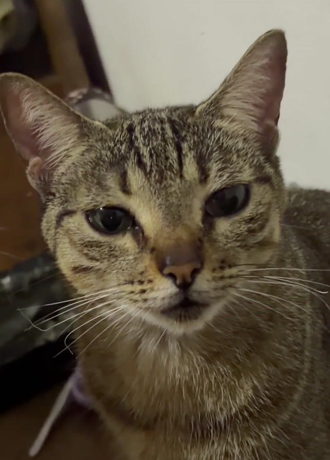 Here's a brief description of the video: A close-up shot of a tabby cat. The cat is looking directly at the camera with a somewhat sleepy or thoughtful expression. The background is blurred and suggests an indoor setting with a white wall partially visible. The cat's fur is a mix of brown and gray, with distinctive stripes on its head.