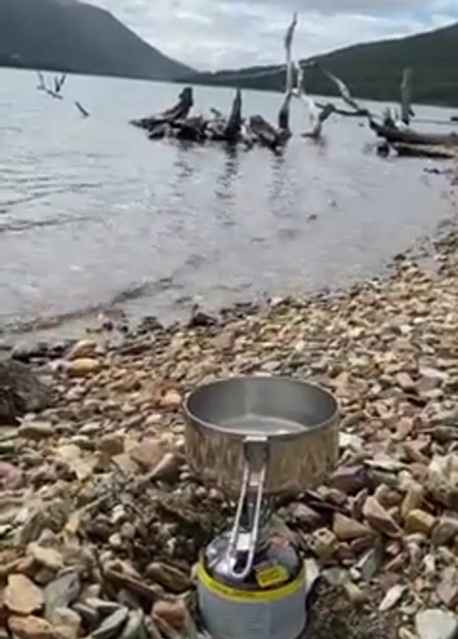 scenic lakeside setting. A metal pot sits on a small portable gas stove, placed on a rocky beach. The lake extends into the distance, with dead tree trunks emerging from the water. The opposite shore is lined with forested mountains under a cloudy sky. The camera pans up from the cooking setup, revealing more of the lake, the shoreline, and the mountain backdrop.