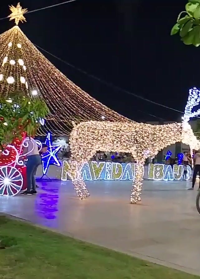 At night, a town square is decorated with Christmas lights. A large light display of a Christmas tree hanging from overhead wires is to the back, with a star on top. In front of the tree is a Christmas carriage light display. To the right is a reindeer light display spelling out "Navidad Baure." People are milling around the square. A person rides a bicycle by the reindeer display, and a boy stands on a scooter next to them. A dog lies on the ground near the scooter.