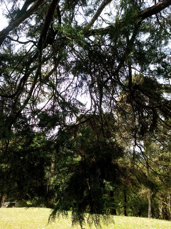 The scene depicts a natural outdoor environment located in Unknown, India. The image is dominated by the dense, dark green foliage and intertwining branches of large trees, heavily obscuring the sky in the foreground and upper portions. Patches of bright, clear sky are visible through the gaps in the canopy. The mid-ground features a sloping expanse of light green to yellowish-green grass. A large, light-colored rock or boulder is situated on the left side of the grassy area. In the background, further trees with lighter foliage density indicate a wooded or forested perimeter. No individuals, animals, specific subjects, actions, or interactions are discernible within the frame.