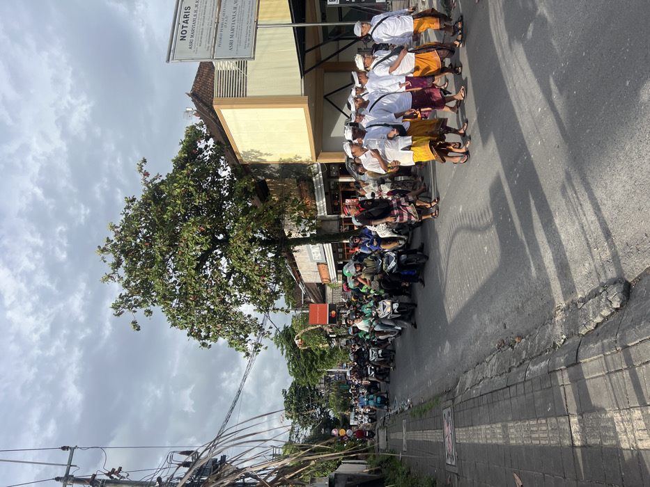 The image captures a street scene in Peliatan, Indonesia. An asphalt road occupies the foreground and midground, featuring a procession of approximately ten to twelve men on the right, walking toward the left. These men are dressed in traditional Balinese attire, including white shirts, patterned sarongs (some yellow, some maroon), and white head coverings (udengs), and wear sandals. Their shadows are cast long on the pavement from the right. To the left of the procession, a dense queue of motorbikes, numbering at least twenty, occupies the remaining road width, facing toward the right. Many riders wear helmets, and some are identifiable as ride-hailing service operators by their green jackets. On the far left, a grey concrete sidewalk with a broken curb runs parallel to the road. Overhanging the sidewalk are utility poles with numerous tangled wires. The right side of the street is lined with commercial buildings. One building features a prominent light-colored, possibly yellow, rectangular facade. A white rectangular sign on the right edge of the image displays text including "NOTARIS" and "ASRI MARVIANI, S.H., M.KN." A large tree with dense green foliage and some reddish elements stands centrally on the right side of the road. The sky above is overcast with scattered grey clouds.