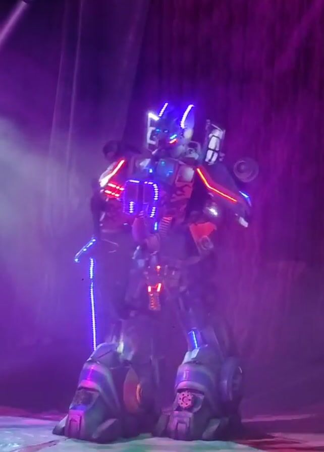 A brightly-lit robot is standing on a colorful floor, likely in an indoor setting. The robot is lit with a combination of blue, red, and white lights, and it also holds a long, illuminated sword. A spotlight shines on the robot. The backdrop behind the robot is a dark curtain.