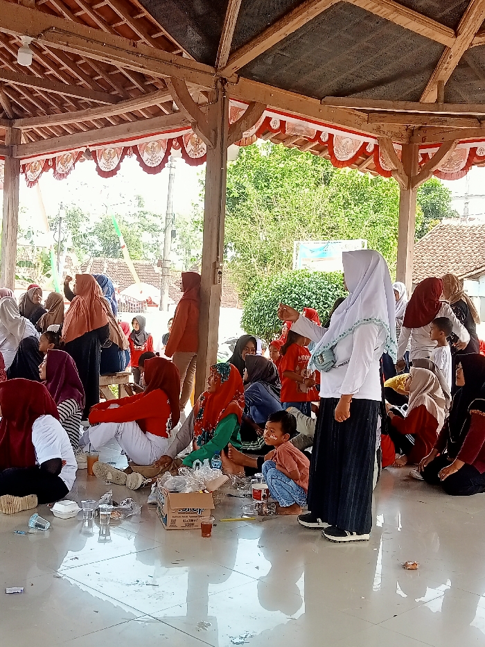 The image captures a crowded, open-sided wooden pavilion located in Sidorejo, Indonesia. Approximately 30-40 individuals, predominantly women and children, are gathered within the structure. The pavilion features a tiled, reflective floor, exposed wooden support posts and roof rafters, and red and white decorative banners with circular emblems strung along the roofline. Many individuals are seated directly on the floor in relaxed postures, while some adults stand. Most adult women wear hijabs of varying colors, including white, maroon, brown, black, and green. A woman in a white hijab, white long-sleeved shirt, and black pleated skirt stands prominently in the mid-ground, facing right, with her right arm slightly raised, holding a small object. To her left, a young child in a light brown shirt and blue jeans is seated on the floor, looking right, with white marks applied to both cheeks. Other children are scattered throughout the group. The foreground of the tiled floor is littered with clear plastic cups, some containing liquid, plastic bottles, discarded food wrappers, and a cardboard box partially labeled "INDOMIE," indicating recent consumption. In the background, beyond the pavilion's perimeter, dense green foliage, residential rooftops, and a utility pole are visible under a bright sky. The overall scene suggests a community gathering or event.