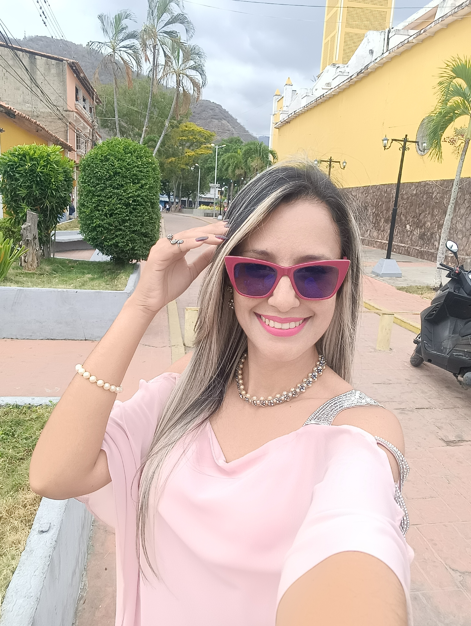A woman is depicted in a selfie, positioned centrally in the foreground of an outdoor urban environment in Las Tejerías, Venezuela. She is an adult with long, straight blonde and brown hair, wearing red cat-eye sunglasses with dark lenses, and pink lipstick. She smiles directly at the camera, displaying teeth. Her attire includes a light pink, off-the-shoulder top featuring rhinestone-embellished straps on both shoulders. She wears a pearl necklace with silver-toned accents and a pearl bracelet on her left wrist. A silver-toned ring, possibly with a butterfly or floral design, is visible on her right hand, which is raised to her temple, touching her hair. The background reveals a paved ground surface, primarily reddish-brown, with green grass patches and concrete curbing. To the woman's right, a prominent, light yellow building with white trim and a distinct tall, multi-story tower-like structure with perforated sides, suggesting a church or public building, dominates the mid-ground. Adjacent to this building are dark-colored street lamps and a stone wall. A dark-colored scooter or motorcycle is parked on the paved area. To her left, a street or pathway extends into the distance, lined with manicured green bushes, concrete structures, and older multi-story buildings with power lines crisscrossing above. Several palm trees and other deciduous trees are visible throughout the scene. In the far background, large mountains or hills rise under an overcast sky, indicating the regional topography.