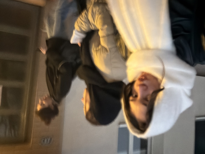 An image depicts three individuals, likely females, in what appears to be an urban outdoor or semi-outdoor setting during dusk or nighttime, illuminated by artificial light. The image exhibits significant motion blur. The leftmost individual, positioned prominently in the foreground, faces the camera with a pouting expression. This person has dark hair visible around the face and wears a large white scarf or hood wrapped around their head and neck, along with a dark jacket. To the right and slightly behind, a second individual is visible in profile, facing towards the right side of the frame. This person wears a dark head covering and a light-colored, possibly beige, padded jacket. Further to the right, a third individual is partially visible, in motion, walking towards a light-colored door. This person has dark hair tied back in a bun, wears a dark coat or jacket, and light-colored trousers, possibly carrying a dark shoulder bag. The background consists of a plain building facade. A rectangular window is visible on the upper left. On the right side, a door with multiple glass panes is present, above which a faint, indistinct number "16" is visible. There are no discernible landmarks, specific architectural styles, or unique identifiers within the image to confirm the precise location as Strasbourg, France.