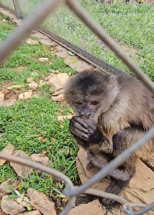 - "small, brown monkey with a black face eating pieces of orange fruit while sitting on a rock inside a fenced enclosure" by FM-L3FhD2, licensed under CC BY 4.0