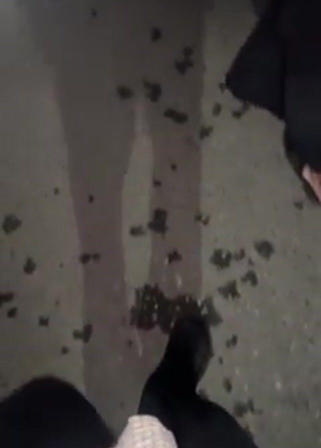 A person wearing black shoes and leggings walks on a pavement with dark patches