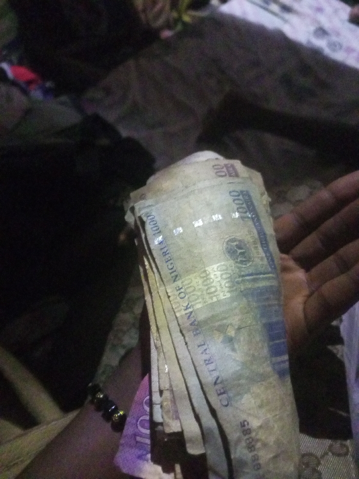 The image presents a close-up, low-light view of a person's hand holding a substantial stack of worn banknotes. The hand, exhibiting a dark skin tone, is positioned in the lower right quadrant of the frame, with a bracelet composed of black and gold-colored beads visible on the wrist. The majority of the currency consists of 1000 Nigerian Naira notes, identifiable by the visible text "CENTRAL BANK OF NIGERIA 1000" and the numerical "1000" denomination. A smaller, purple-toned banknote, partially visible beneath the main stack on the left, appears to be a 100 Naira note, indicated by "100N". The background is dark, out of focus, and indistinct, suggesting an indoor environment with textures that could be fabric or bedding. The specific location in the city of Unknown, Unknown is not discernible from the provided visual information.