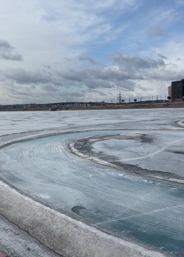 wintery scene, featuring a frozen body of water, likely a river or lake, covered in a layer of ice and snow. The ice appears to be quite thick and has been marked with curved paths, possibly made by vehicles or other means. White snow edges the path. In the background, there's a cityscape with buildings, including high-rise residential apartments, and some industrial structures. The sky is overcast with a mix of dark and light clouds, creating a somewhat gloomy atmosphere. The camera pans slowly across the scene, providing a wide view of the frozen landscape and the buildings on the shoreline.
