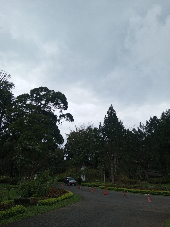 A winding asphalt road is lined with orange cones amidst green foliage. A dark vehicle advances along the road. Towering trees and lush greenery frame the scene under an overcast sky. A small building with a distinct roof is partially visible further up the slope. The overall atmosphere evokes a calm, nature-filled environment.