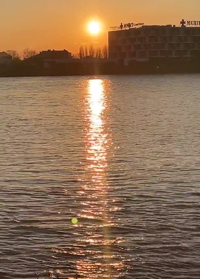 - "scenic sunset over a body of water, reflecting the sun's glare, with a building and other structures visible in the background" by FM-nqCY52, licensed under CC BY 4.0