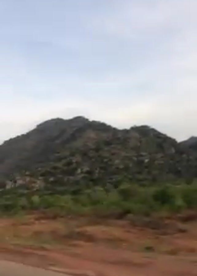 drive along an asphalt road toward a distant vehicle. The landscape features mountainous terrain, with the hills covered in vegetation. The sky is predominantly overcast, with a pale, muted light. The perspective is from within a moving vehicle, with the road occupying the foreground. The sides of the road are characterized by dry, scrubby vegetation.