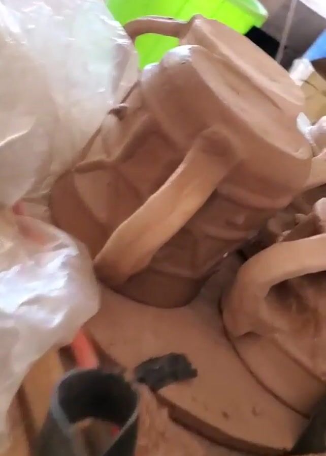 group of unglazed clay mugs on a table in a cluttered workshop environment. The mugs are light brown, cylindrical in shape, and have handles. They are partially covered with a crumpled plastic bag. A long, curved, dark-colored tool lies nearby. The background includes a green plastic bucket, cardboard boxes, and various other unidentified items. The lighting is somewhat dim, and the camera moves slightly, providing different angles of the mugs.