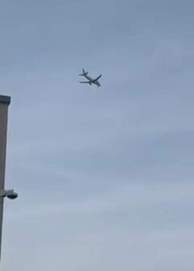 n airplane in flight against a pale blue sky with thin clouds. The plane is a light color and appears to be ascending and moving away from the viewer. In the lower left corner is part of a building, appearing tall and beige with a light-colored surveillance camera affixed to the side. The camera slowly zooms into the plane as it travels across the sky.
