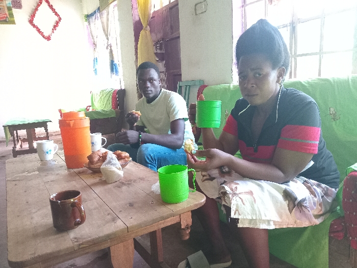 A man and a woman sit at a wooden table in a room. The table is set with an orange jug, mugs, and a bowl of pastries. The man wears a white shirt and jeans, eating a pastry. The woman holds a green mug and a pastry. She wears a shirt with red stripes and a white skirt. The room has curtains, and a green sofa is behind the woman. A decoration hangs on the wall.