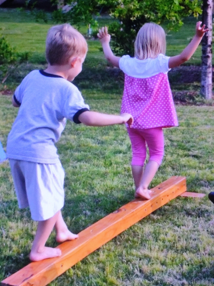 The image displays two young children outdoors on a grassy area, interacting with a wooden beam