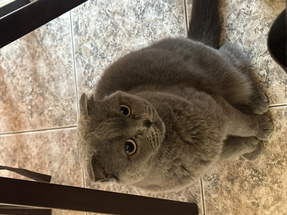 A domestic feline, identified as a Scottish Fold cat due to its characteristic folded ears, is depicted seated on an interior tiled floor. The cat possesses a solid blue-grey coat and prominent amber-yellow eyes. Its posture is upright, with its front paws tucked, and it faces forward, slightly angled towards the viewer. The tiled floor features a mottled beige and light brown pattern with visible grout lines. Partially visible in the upper left and upper right quadrants are dark brown, likely wooden, furniture legs. A dark, indeterminate object, possibly a shoe or slipper, is present in the lower right corner. The scene is illuminated by ambient indoor light. This indoor setting is located in Varna, Bulgaria.