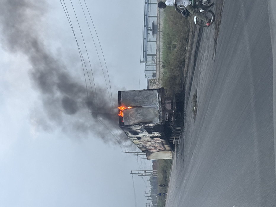 A truck is on fire, with flames visible at the back and thick black smoke rising into the gray sky. The truck appears to be on the side of a road, and a person on a bicycle is seen at the top of the frame. Utility poles and lines run along the road. In the distance, there are structures and green vegetation. The road is wet and reflects the overcast sky.