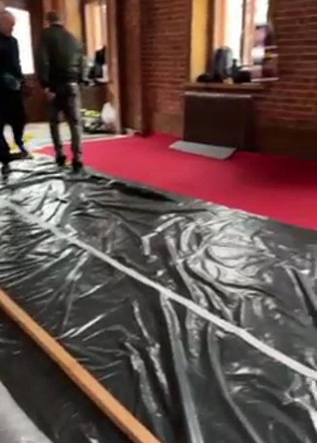 interior of a room with red carpeting. Two men walk through an opening in a brick wall at the far end of the room. A large black plastic sheet is laid out on the floor, with white tape around its edges and several wooden planks along the side. Several yellow straps are also lying on the floor, while two other men crawl on the carpeting. The camera is tilted at a low angle.