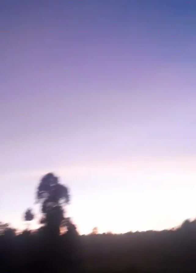 blurry, low-resolution scene of trees silhouetted against a sky transitioning from light purple near the horizon to a deeper violet higher up. The camera is moving, suggesting it is handheld or in a vehicle. There is some vegetation visible in the lower portion of the frame.