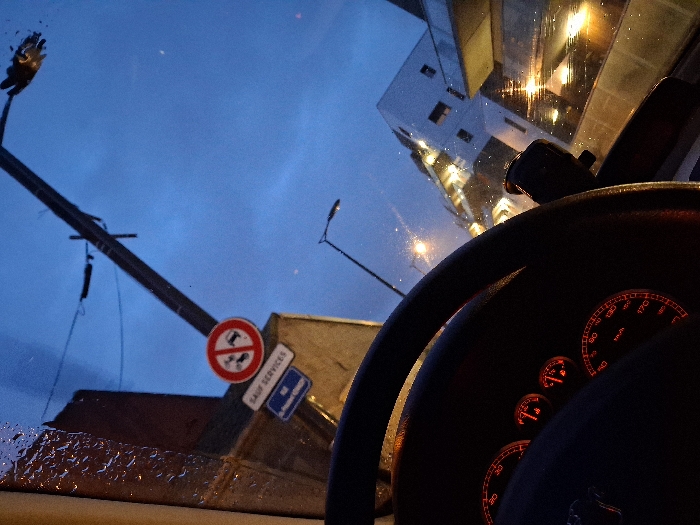 View from inside a car, looking through the windshield at a rainy urban scene. A street sign prohibiting vehicles with trailers is visible. Streetlights and a modern building reflect in the wet glass. The steering wheel and dashboard are prominent in the foreground, illuminated with red gauges. The dark blue sky suggests either dawn or dusk.