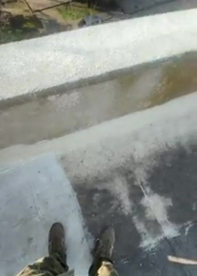 person wearing military fatigues standing on a concrete ledge, possibly the roof of a building. The camera pans up and outward, revealing a view of a building across a courtyard with trees and a parked car. Two people are visible walking toward the building. The sky is clear and blue. The ledge the person stands on is partially covered in a white, powdery substance, possibly snow or residue. The overall setting appears to be an outdoor urban environment.