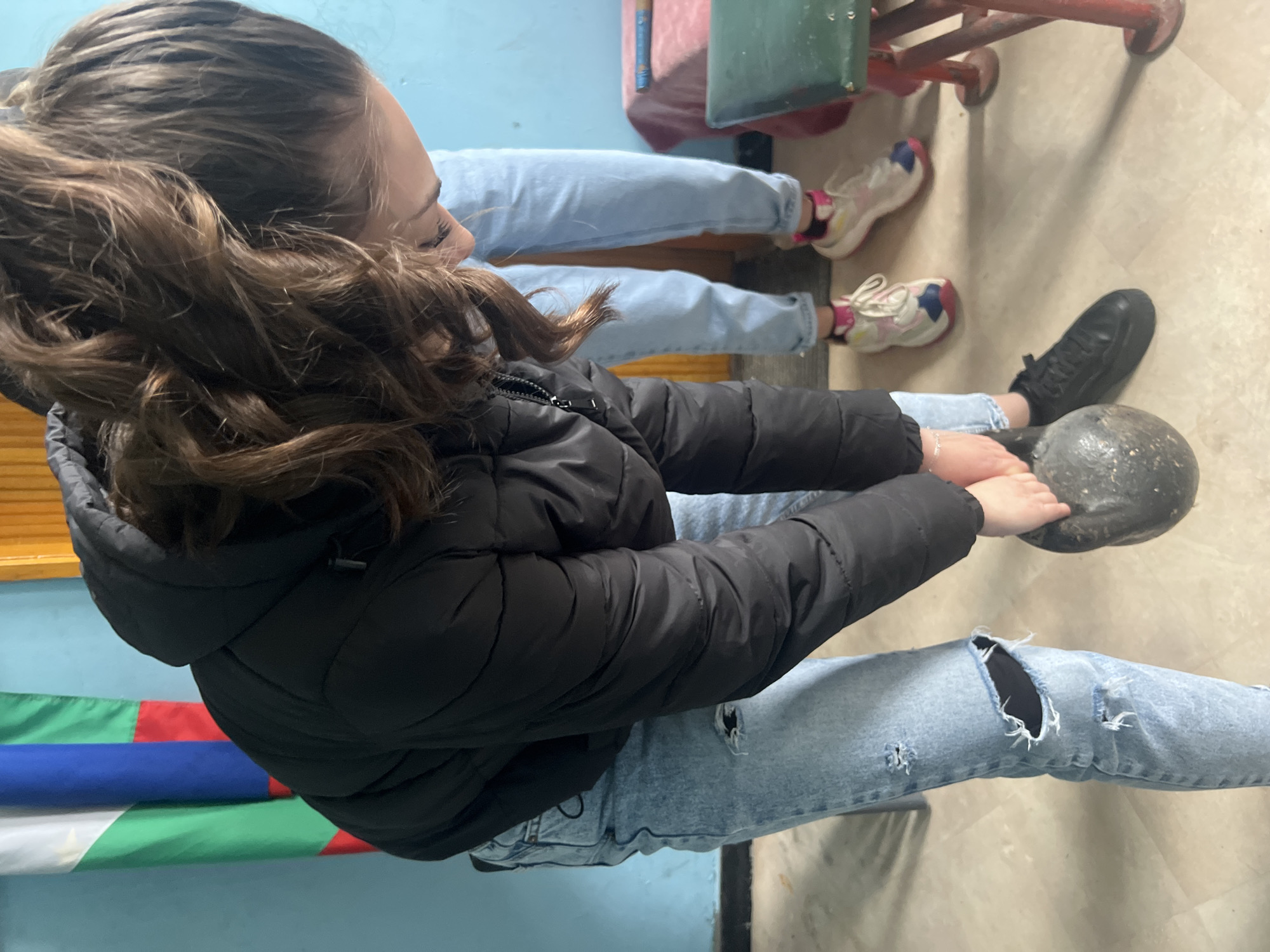 In Cherven Bryag, Bulgaria, an indoor scene displays a young female subject bent forward, grasping a dark, worn kettlebell with both hands. She wears a black puffer jacket with a hood, light blue ripped jeans exhibiting a large tear on the left knee and smaller tears on the right thigh, and a black flat shoe on her left foot. A silver bracelet is visible on her left wrist. Her brown hair is pulled back into a high ponytail. To the right and slightly behind the primary subject, the lower legs of a second individual are visible, standing upright, wearing light blue jeans and multicolored athletic shoes with pink socks. The background consists of light blue painted walls, a partially visible vertically hung Bulgarian flag with green, white, and blue stripes on the left, and a wooden door frame. The floor is light-colored tile or linoleum. On the far right, a green-topped stool with red metal legs and a partially obscured surface draped in pink fabric, bearing a blue object, are present.
