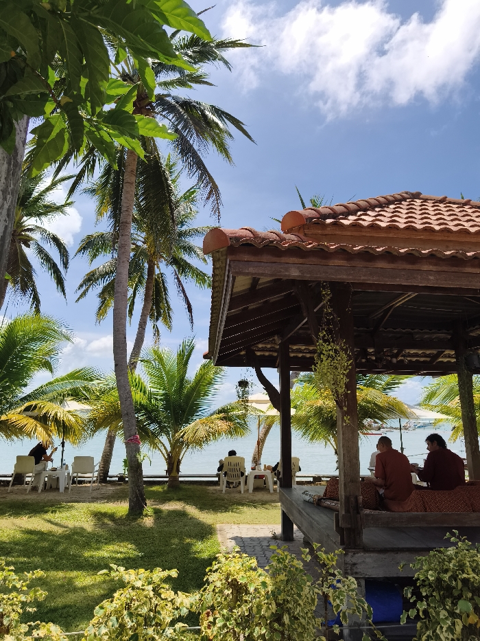 A serene tropical scene features a thatched-roof gazebo with two people inside. Beyond the gazebo, a lush green lawn stretches toward the ocean. Palm trees dot the landscape, and some chairs with umbrellas provide additional seating near the shore. The sky is a vibrant blue with scattered clouds. The entire scene suggests a tranquil and relaxing vacation destination.
