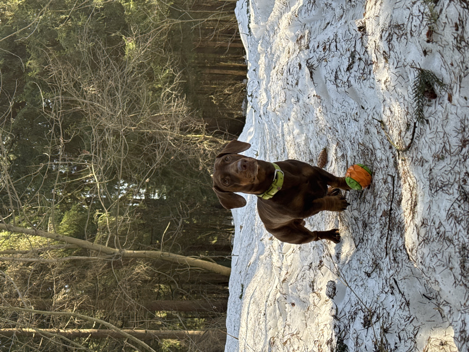 - "A solid dark brown, short-haired Dachshund dog with floppy ears and a lime green collar stands on a snow-covered forest path in the city of Zelenogradskiy, Russia" by FM-xqHZp2, licensed under CC BY 4.0