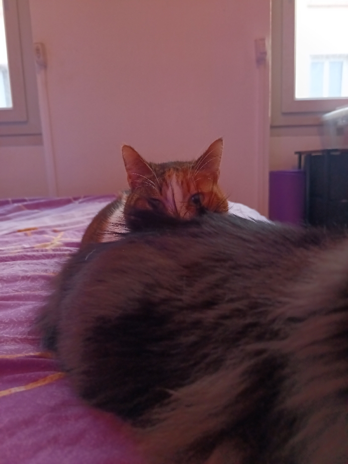 Two cats rest on a purple bed. The first cat, orange and white, has its eyes closed. Its pointed ears stick up alertly. The second cat, a mix of black and gray, occupies the foreground. Its fluffy fur dominates the view. In the background are two windows and a white cabinet, all slightly blurred. A purple tube stands beside a dark container.