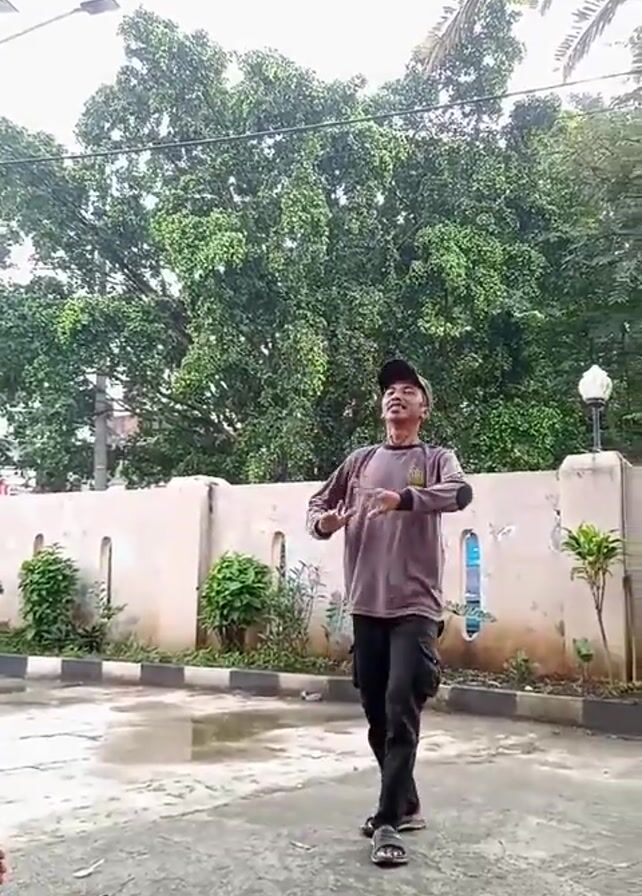 A man in his early 30s dances in an outdoor paved area on a cloudy day. He wears a gray long-sleeved shirt with a logo, black cargo pants, sandals, and a baseball cap. The dance moves are energetic and expressive, with wide arm movements and footwork. Behind him is a low white wall with green plants, and a backdrop of lush green trees. There is a street lamp attached to one of the pillars in the background. A portion of a table with objects, including what appears to be toy cars, is visible in the bottom left corner of the frame.