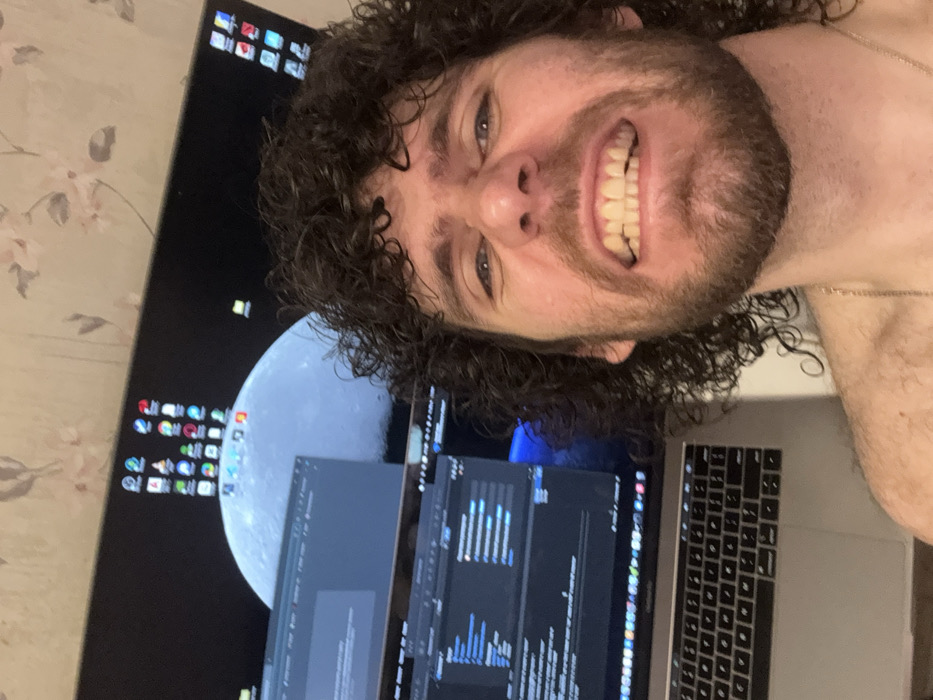 A male individual with dark, curly hair and a beard is captured in a close-up selfie, grimacing with his teeth exposed, looking directly into the camera