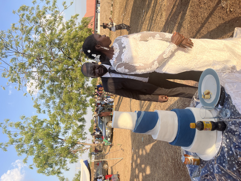 An outdoor event, likely a wedding reception, is depicted under clear, sunny skies in the city of Unknown, Nigeria