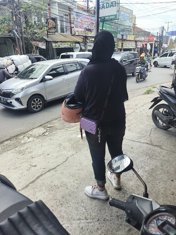 A person wearing a black hijab, dark shirt, blue jeans, and white sneakers stands on a sidewalk. They hold a pink helmet and have a small purple purse on their shoulder. A silver car and several motorbikes are on the road behind them. A black motorbike is parked in front of the person, partially blocking the view. Buildings and billboards line the street.