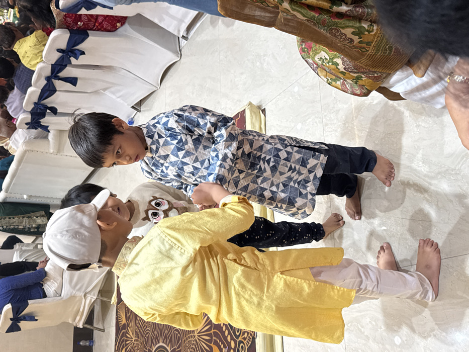 This indoor image from New Town, India, features three young boys interacting in the foreground, while an event gathering unfolds in the background. The boy on the left, wearing a light yellow kurta, light-colored pajama pants, and a white baseball cap worn backward, stands barefoot, angled towards the right. He is holding the hands of the boy on his right. This second boy is barefoot, dressed in a blue, black, and white geometric patterned kurta over dark pants, and faces the first boy with a focused expression. A third boy, partially obscured and standing slightly behind the first two, is also barefoot, wearing a light-colored top with a brown owl graphic and dark patterned pants; he looks towards the boy in the yellow kurta with a slight smile. The floor is composed of large, light-colored tiles reflecting overhead light. In the background, white chairs draped with white covers and accented with dark blue sashes tied in bows are arranged in rows. White sofas are also visible. Numerous adults are seated throughout the background, their attire varied, including traditional garments. A patterned rug is partially visible on the far left. A plastic water bottle rests on the floor next to a chair. In the lower right corner, a portion of an adult's arm, adorned with a bracelet, is visible alongside patterned fabric, likely from seating.