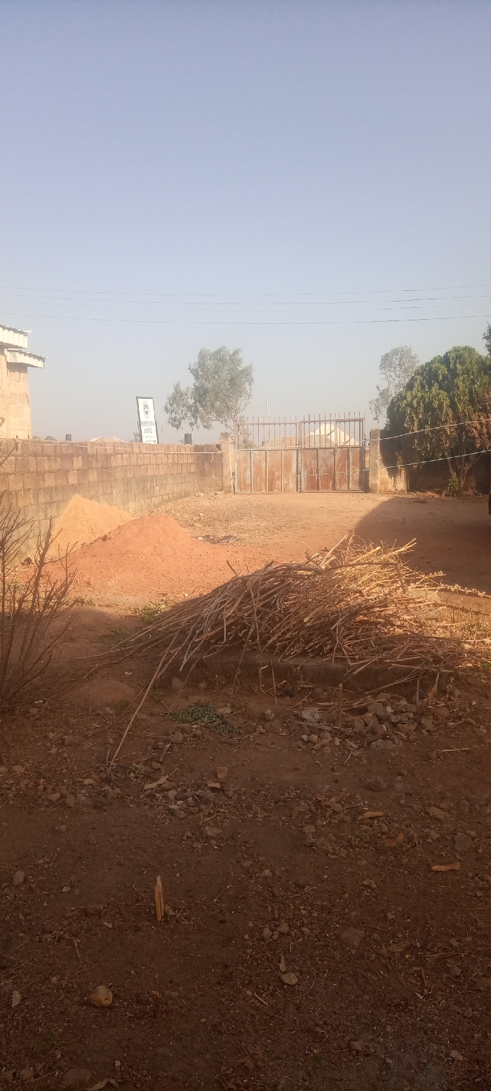 A dusty, sunlit yard features a pile of branches in the foreground. Behind, a heap of sand sits near a brick wall topped with an advertising sign. An aged metal gate spans the yard's rear, flanked by trees. The ground is a reddish-brown, with sparse vegetation. Overall, the scene conveys a rural or semi-urban setting with signs of construction or yard work.