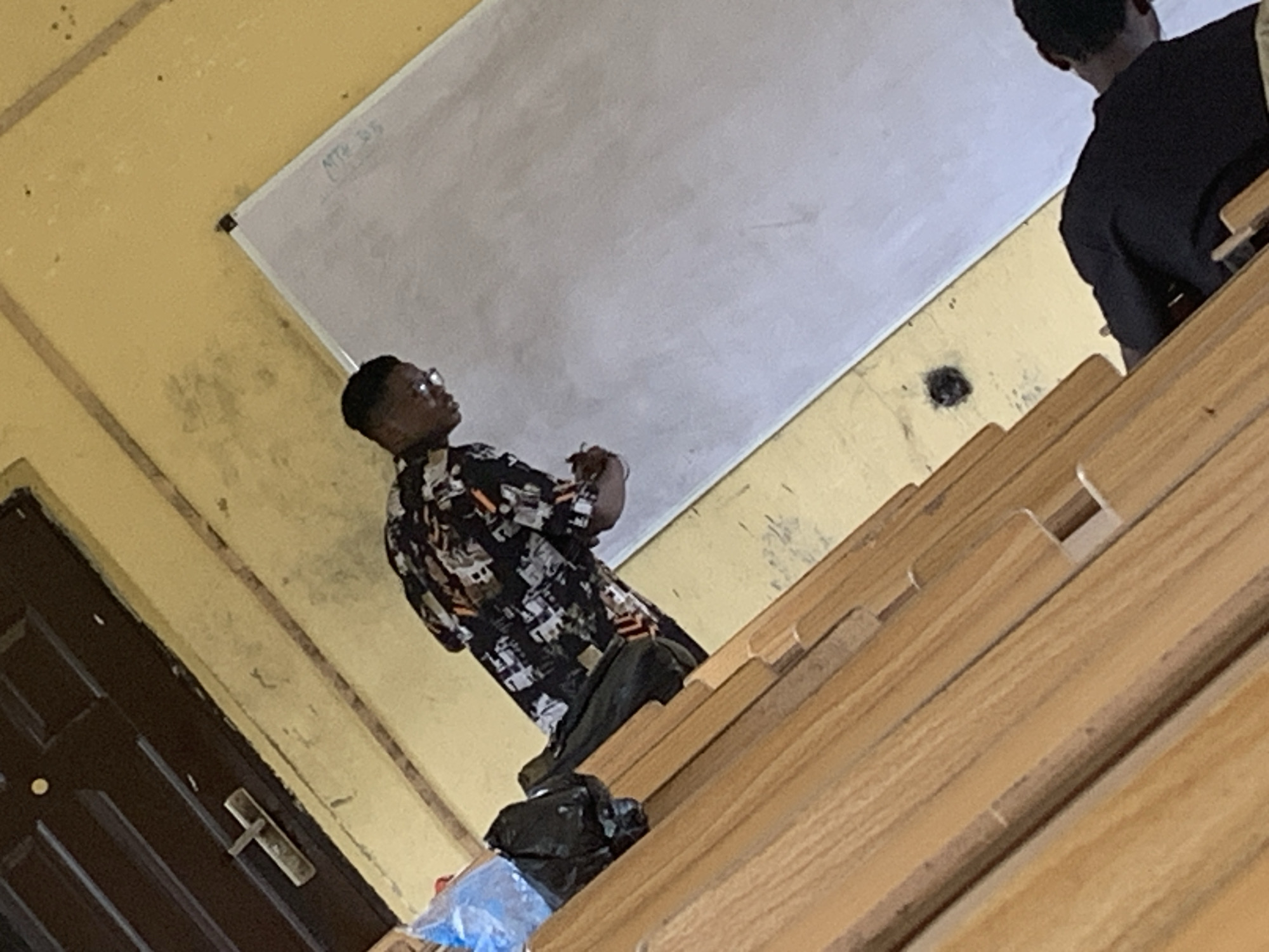 An indoor scene within a building in Ihiagwa, Nigeria, captured from a low angle looking upwards. The foreground and mid-left are dominated by multiple rows of light brown wooden tiered seating, characteristic of a lecture hall or classroom. On one of these desks in the mid-left, a crumpled blue plastic bag rests next to a black plastic bag. In the mid-ground, a male individual with a faded haircut and glasses is visible, wearing a black shirt with abstract patterns in white, orange, and brown. He is standing or slightly crouched, facing towards the right side of the frame, with his hands clasped together in front of him. The background consists of a light yellow wall, showing signs of wear and discoloration, including a dark circular mark towards the bottom right. A large, rectangular white board is mounted on this wall, displaying faint writing "NTD 303" in its top right corner. In the top left corner of the frame, a dark brown door with a silver-colored handle is visible, set into the yellow wall. Partially visible in the bottom right corner, another male individual, wearing a black long-sleeved shirt, is seated at a wooden desk, leaning forward.