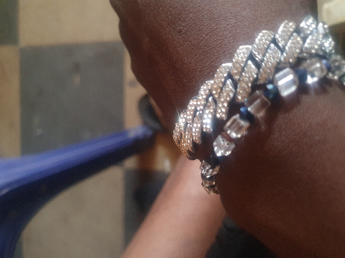 The image presents a close-up, angled view of a person's dark brown arm and wrist, adorned with two bracelets. The prominent bracelet is a silver-toned, Cuban link style, densely encrusted with numerous small, clear, reflective stones arranged in a double-row pattern. A second bracelet, partially visible beneath the first, consists of clear, rectangular beads interspersed with smaller, dark blue or black round beads. The background is out of focus, showing a tiled floor featuring a checkerboard pattern of light brown and dark grey square tiles. A segment of a blue plastic chair leg is visible on the left side of the frame. No specific details or landmarks are present in the image to determine its precise location within the city of Manchester, United Kingdom.