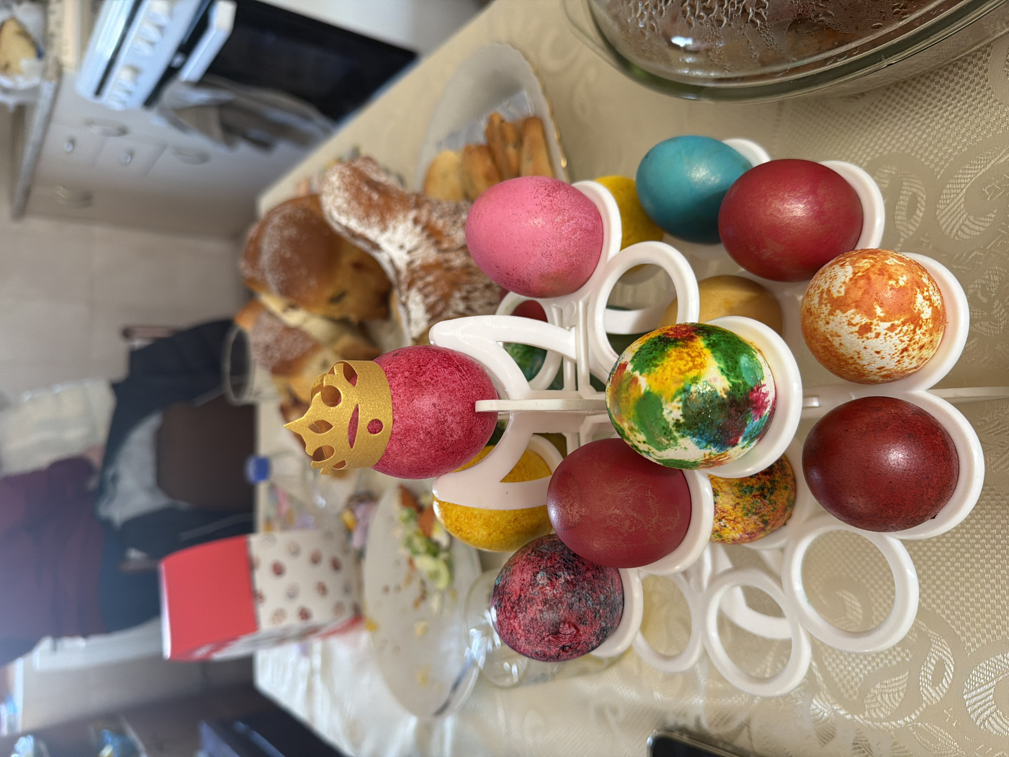 table setting, likely indoors, with a focus on Easter traditions. The table is covered with a patterned tablecloth. In the foreground is a white plastic egg holder filled with vibrantly colored Easter eggs, including shades of red, blue, pink, yellow, and multicolored designs. One egg is decorated with a golden crown. A plate with remnants of food, possibly a salad, sits nearby, along with a patterned box. In the background are baked goods, possibly sweet bread and pastries, arranged on a platter. Further back, there's a glimpse of an oven and a glass bowl containing food. The location of Milevo, Bulgaria, is not explicitly evident from the image.