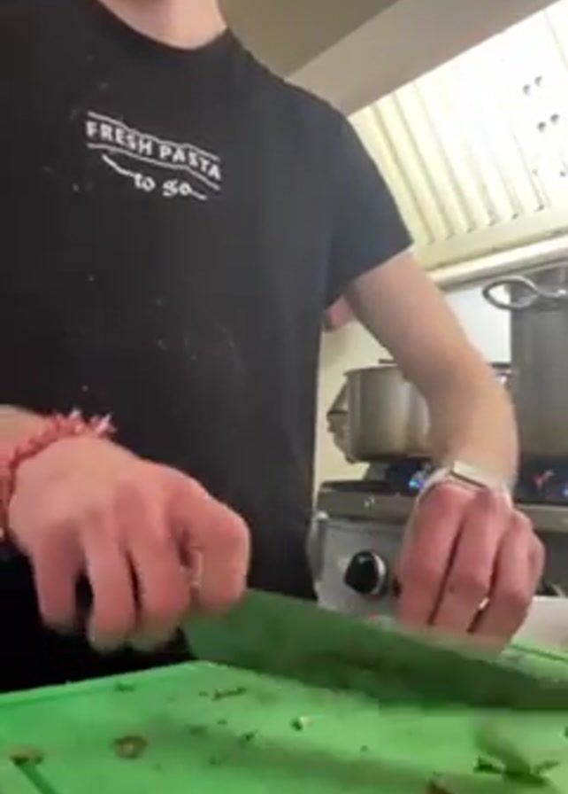A young man is shown from the mid-chest up, facing toward the camera, chopping parsley on a green cutting board. He is wearing a black t-shirt that says "FRESH PASTA to go" in white lettering. He is wearing glasses and a watch and has a red bracelet on his left wrist. He is using a large knife. A stainless steel pot is on a blue gas flame on a stovetop behind the cutting board. The environment appears to be a commercial kitchen.