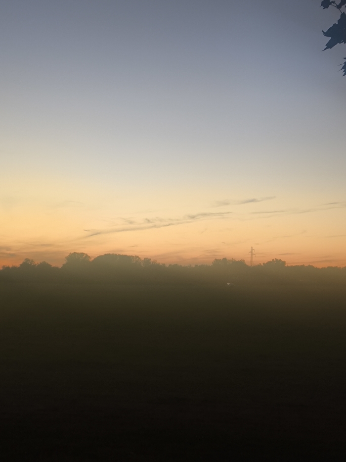 The image depicts an outdoor landscape scene in Brumath, France, during a low-light period, likely dawn or dusk, characterized by significant ground mist. The sky transitions from a light blue at the top to an orange-yellow hue near the horizon, with faint, horizontal cloud streaks. A dense band of mist obscures the lower portion of a distant tree line that spans the horizon. Above the tree line, a dark, vertical power line pylon is visible on the right side. The foreground consists of a dark, indistinct field, heavily veiled by the mist. A small, light-colored, unidentified object rests within the misty field in the mid-ground. Dark, silhouetted leaves from an overhead tree are partially visible in the upper right corner. No people or observable actions are present.