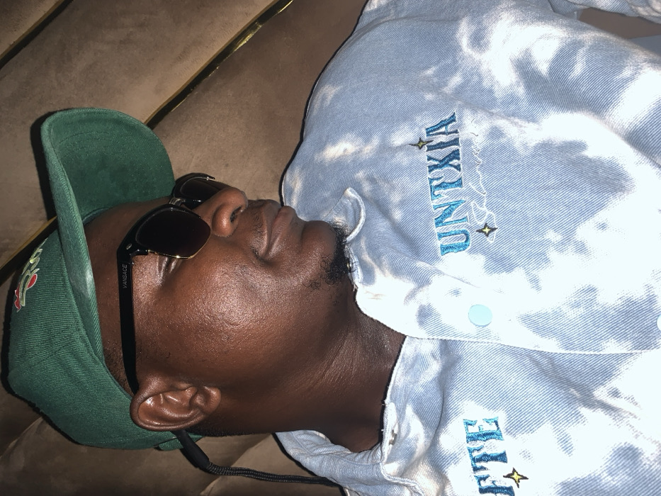 An individual is depicted in a close-up, chest-up shot within an indoor setting in Akwanga, Nigeria. The subject is a male, appearing to be of African descent, presented in a three-quarter profile facing right with a slight smile. He wears a dark green baseball cap, featuring an embroidered design of red and green elements on the front. Dark sunglasses with black frames and gold-colored lower rims, labeled "VANSACE" on the left temple arm, cover his eyes. A dark strap, consistent with an eyewear retainer, extends from behind his left ear. He is clad in a light blue denim jacket exhibiting an acid-washed or bleached pattern. The jacket has visible light blue buttons and features prominent blue embroidered text: "UNTXIA" with a small star-like symbol and faint script below it on the right chest, and a partial "FTE" with a similar star on the left chest. The background consists of a light brown, possibly upholstered or padded surface, with a vertical gold-colored trim element visible on the right side of the frame.