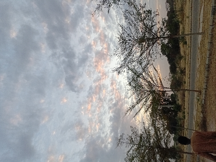A partly cloudy sky with peach highlights above a sparse treeline. A narrow gray road bisects dry grassy areas. Trees are slender with delicate branches. A person is faintly visible in the foreground. The scene has a muted, almost dusty quality, typical of a late afternoon or early morning setting.