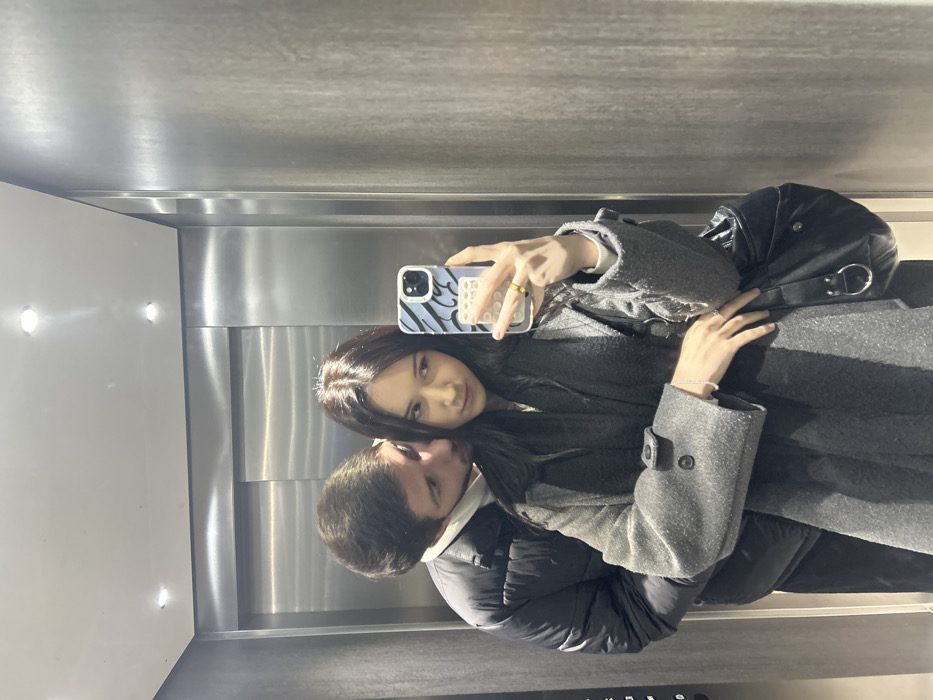 A couple is taking a selfie in a mirrored elevator. The woman has long, dark hair and is wearing a grey coat. The man is behind her, wearing a black puffer jacket. She is holding a smartphone with a patterned case, her hand adorned with rings. A black purse hangs off her shoulder. The elevator interior is metallic with ceiling lights.