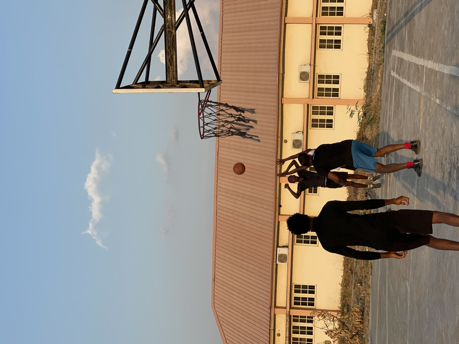 Four men play basketball on an outdoor court. A basketball hoop with a tattered net stands to the left. Three men leap towards the ball, which is in the air, while a fourth man stands observing. Behind the court is a pale yellow building with windows and air conditioning units. The sky is clear, with a few small clouds visible.